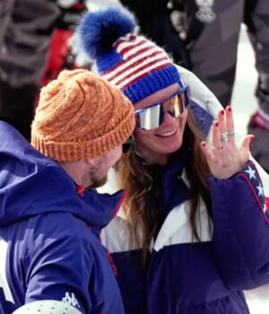 O namorado de longa data de Johnson, Connor Watkins, pediu-a em casamento perto da linha de chegada, cercado por membros da equipe de esqui dos EUA.