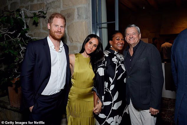 Quatro em cada cinco fotos da Duquesa de Sussex abraçando o chefão Ted Sarandos e sua esposa Nicole Avant desapareceram misteriosamente esta semana.