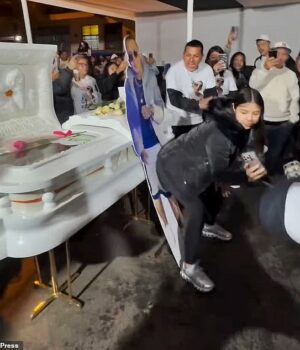 A viúva do momento incrível que a viúva tremia contra o caixão aberto de seu falecido marido durante seu funeral