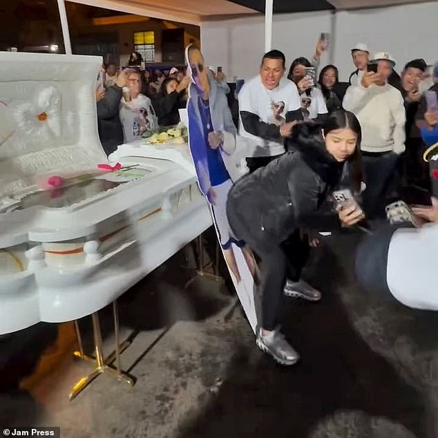 Mas uma das mandíbulas do Peru foi virada quando uma viúva foi capturada na câmera contra o recorte em tamanho real de seu falecido marido contra seu caixão aberto.