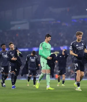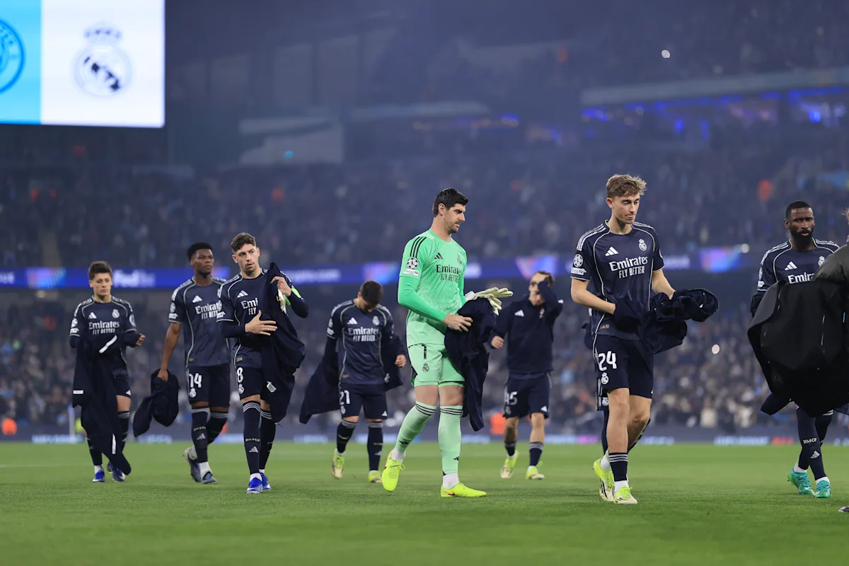MANCHESTER, INGLATERRA – 17 DE MARÇO: Jogadores do Real Madrid, incluindo o goleiro do Real Madrid Thibaut Courtois, durante a partida das oitavas de final da UEFA Champions League 2025/26 entre Manchester City FC e Real Madrid CF no Manchester Stadium, City of Manchester, City of Manchester, 0267 Tirando as jaquetas antes de uma partida entre o Madrid CF (Foto de Simon Stackpool/Offside/Offside via Getty Images) | Impedimento via Getty Images
