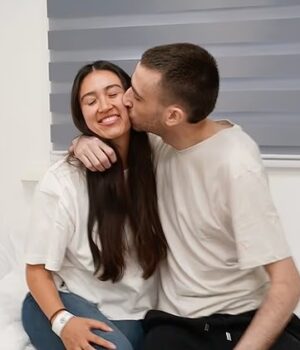 Avinatan abraça sua namorada, antes de colocar a mão em seus ombros e beijá-lo no rosto e apertá-lo com força.