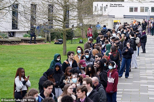 Estudantes fazem fila para tomar antibióticos em frente a um prédio da Universidade de Kent, em Canterbury. A universidade confirmou que uma das duas mortes por meningite na região era de um estudante.