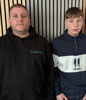 Euan Williams, 15, (foto à direita) com seu pai Lee, 47. O estudante está passando por testes depois de usar um alicate esterilizado para ajustar o aparelho há três semanas