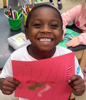 Macri Snelling, 6 anos, mostra seu desenho da escola. A criança morreu após ser atropelada por um caminhão de paisagismo
