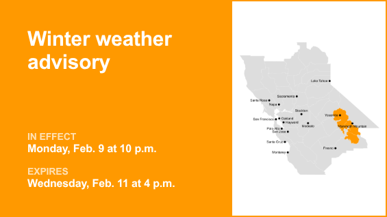 Yosemite é o foco de um alerta meteorológico de inverno emitido pelo Serviço Meteorológico Nacional às 11h48 de sábado. A assessoria é válida de segunda-feira, às 22h, até quarta-feira, 11 de fevereiro, às 16h.
