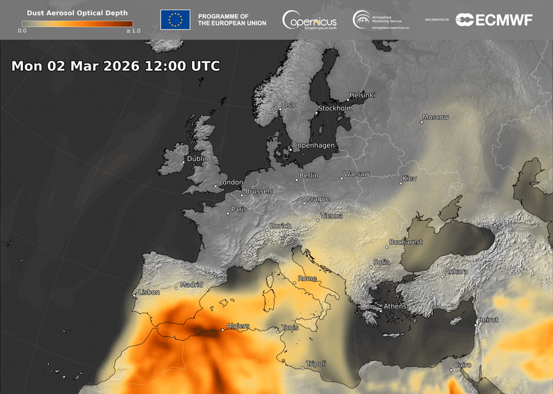 A poeira composta por areia e partículas minerais do deserto do Norte de África foi transportada milhares de quilómetros a norte, em direção ao Reino Unido, nos últimos dias.
