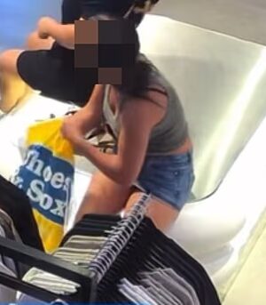 Imagens de CCTV mostram a mulher tirando peças de roupa do cabide, dobrando-as e colocando-as em uma sacola de compras de uma loja diferente.