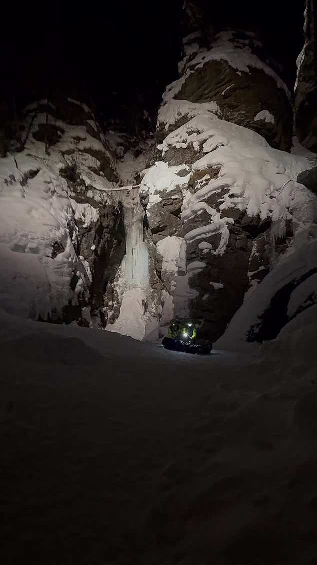 O vídeo fornecido ao Daily Mail mostra equipes de resgate da Alpine chegando de helicóptero, com cascatas de água visíveis ao fundo enquanto as equipes trabalham para recuperar o corpo do homem.