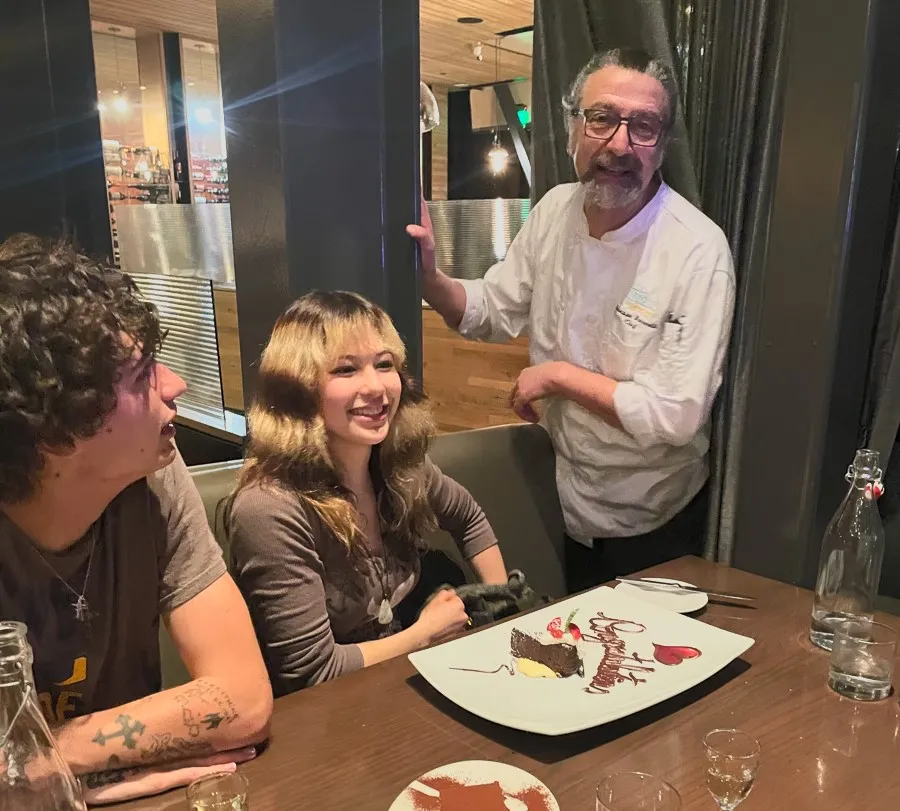 A refeição terminou com uma mesa repleta de sobremesas, incluindo um bolo de chocolate sem farinha, no qual o chef havia batido a palavra “parabéns” no chocolate.
