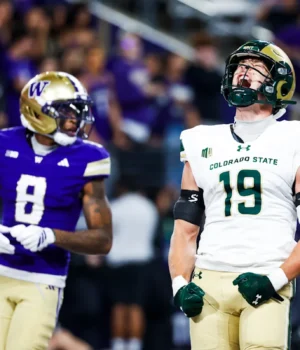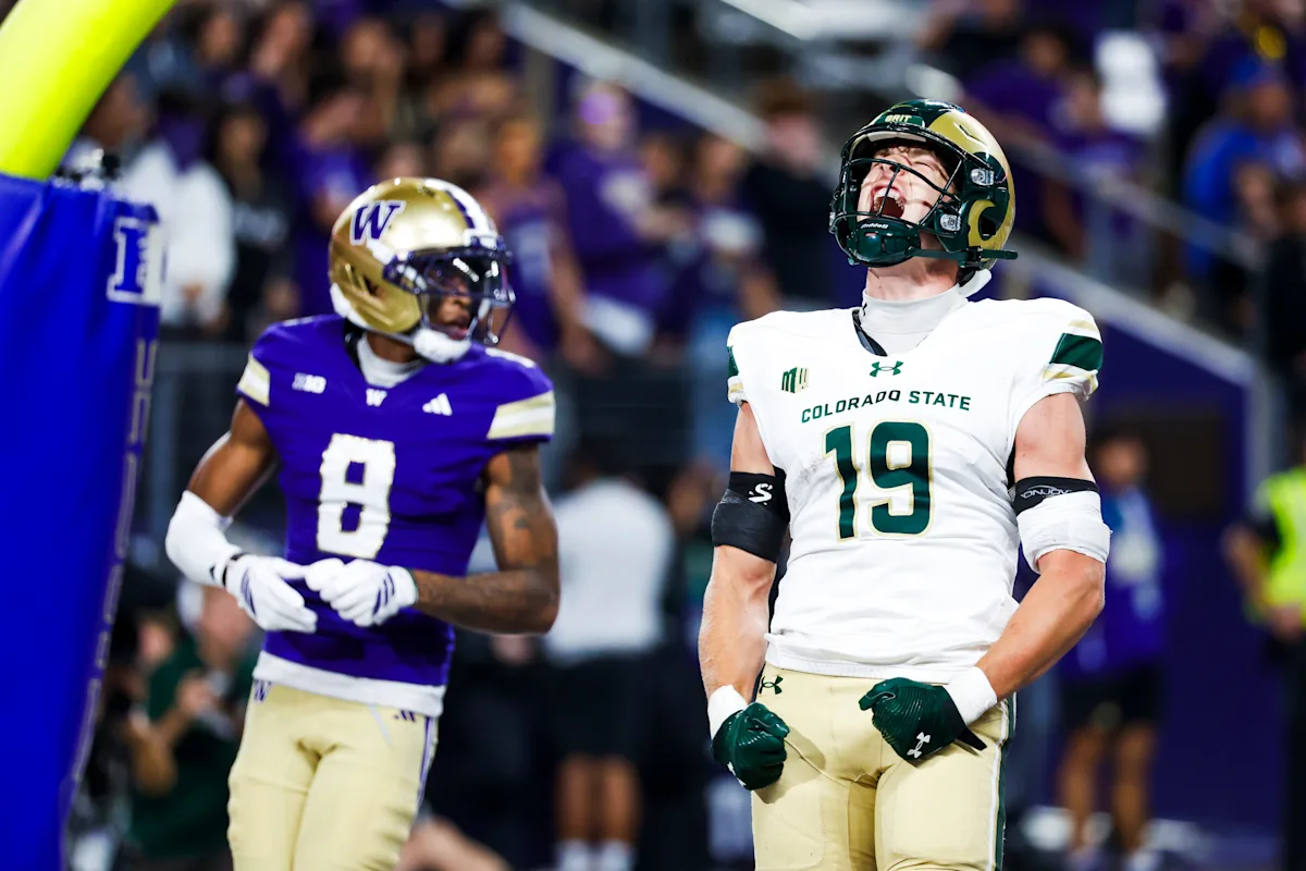 30 de agosto de 2025; Seattle, Washington, EUA; O tight end do Colorado State Rams, Jackson Warren (19), reage após receber um passe para touchdown contra o Washington Huskies no terceiro quarto no Husky Stadium. Crédito obrigatório: Imagem de Joe Nicholson-Imagon