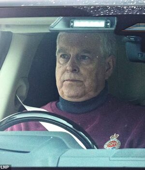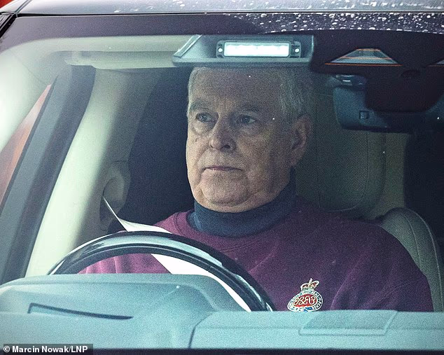 Andrew Mountbatten-Windsor foi fotografado dirigindo em Windsor hoje vestindo um suéter da Guarda Granadeiro enquanto se prepara para deixar o Royal Lodge.