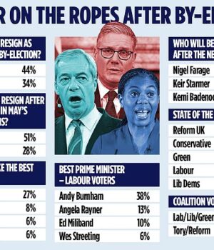 A pesquisa de Lord Ashcroft, compartilhada exclusivamente com o Mail on Sunday, mostrou que 44 por cento dos entrevistados concordaram que o primeiro-ministro Keir Starmer deveria renunciar depois de perder as eleições suplementares de Gorton e Denton.