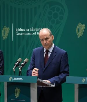 Tanaiste Simon Harris, Taoiseach Michael Martin e o Ministro de Estado Sean Kenny anunciaram medidas para reduzir o consumo de energia em edifícios governamentais.