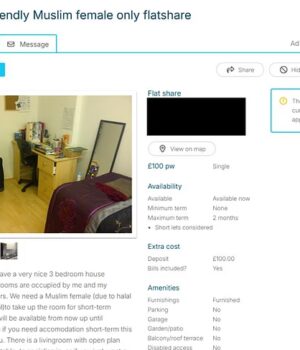 O título do seu anúncio: “Quarto individual num apartamento muçulmano, East London”. Em género, diz: “os homens preferem”. O anúncio também dizia: ‘Quarto individual para uma pessoa. O quarto é duplo, mas está sendo alugado apenas para uma pessoa. Diz ‘todos os esportes e filmes disponíveis’.