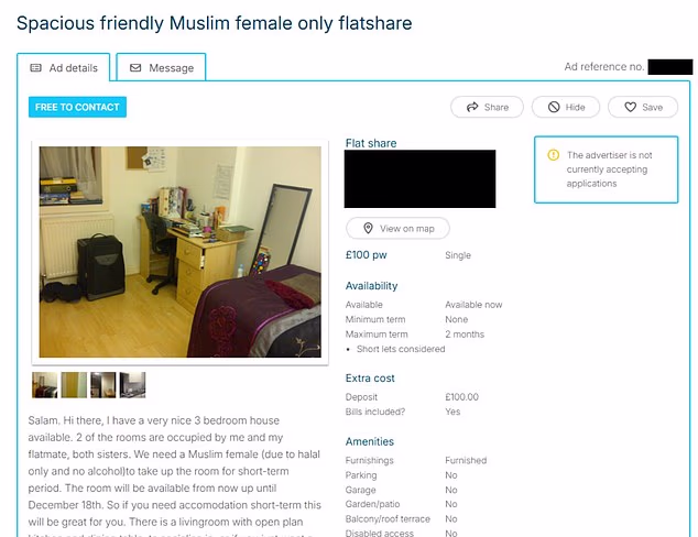 O anúncio do quarto – listado como quarto vago com contas de serviços públicos para inquilinos de £ 600 por mês – descreve-o como uma “família muçulmana, sem comida não halal, álcool, etc”.