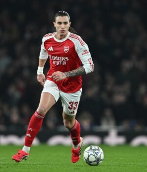 O defesa italiano Riccardo Calafiori não foi incluído na equipa titular ou no banco de suplentes do Arsenal para o jogo dos quartos-de-final da UEFA Champions League, na noite de quarta-feira, frente ao Sporting.