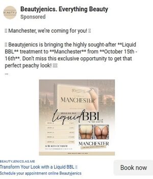 Beautizenics tentou tentar os clientes com esse anúncio no Facebook: ‘Não perca esta oportunidade exclusiva de obter esse visual perfeito de pêssego’.