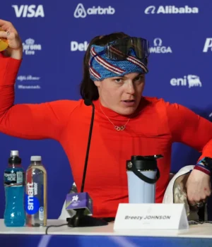 “Eu estava pulando e toda a fita da medalha caiu. E então eles tentaram consertá-la, mas não conseguiram. Então, em vez disso, eles me deram e eu tive que ir gravá-la”, disse Johnson, enquanto exibia sua nova medalha no Late Night Olympics Show da NBC.