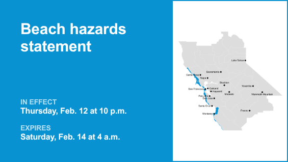 Point Reyes National Seashore, a costa da Península de São Francisco e o sul da Baía de Monterey e a costa de Big Sur, bem como a costa da Baía Norte, incluindo o condado de São Francisco, estão sob uma declaração de risco de praia emitida pelo Serviço Meteorológico Nacional às 4h25 de quinta-feira. A declaração é válida das 10h às 16h. Sábado, 4 de fevereiro.
