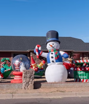 É uma exibição enorme, completa com um boneco de neve inflável gigante, luzes cintilantes em todas as superfícies e um Papai Noel de plástico e um trenó com renas no telhado.