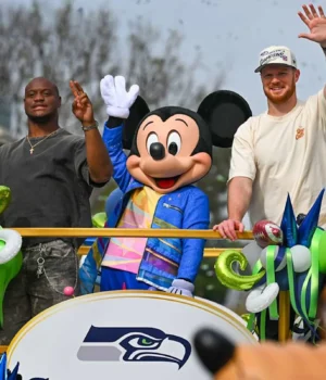 O quarterback do Seattle Seahawks, Sam Darnold, e o running back Kenneth Walker III comemoram sua vitória no Super Bowl na Disneylândia na segunda-feira, 9 de fevereiro.
