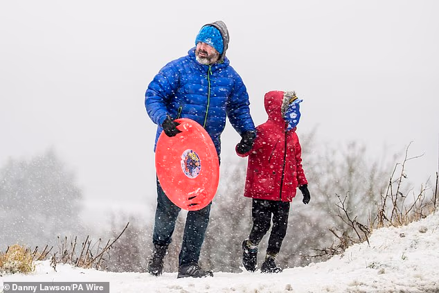 As famílias estão aproveitando ao máximo a neve hoje enquanto pegam seus trenós para se divertir ao ar livre, apesar do frio.