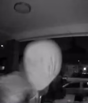 O vídeo de vigilância capturou o suspeito, vestindo máscaras e todas as roupas pretas, saindo de casa e andando na calçada, que parecia um pouco irregular.
