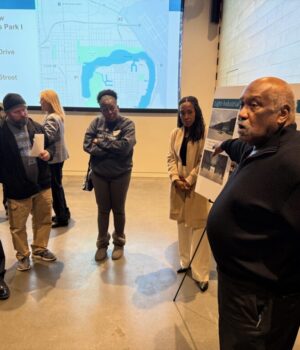 Membros da comunidade se reúnem para discutir opções para um projeto de parque empresarial em North Omaha pronto para uso. George Achola, parte da equipe de desenvolvimento, responde a uma pergunta do Conselho de Brenda. (Cortesia de Rebecca S. Graetz)