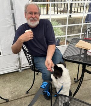 Greg Reid de Benicia, na manhã de sábado, Valizo, Sixth Street Moshey Coffee, tem gosto de café moshey grátis do cacau de seu cachorro no cacau de seu cachorro.