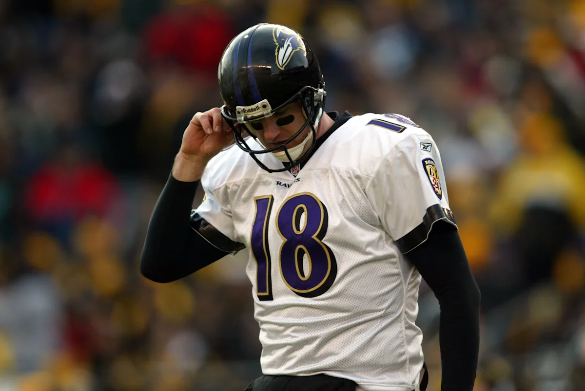 20 de janeiro de 2002: O quarterback do Baltimore Ravens, Elvis Groback, durante o jogo dos playoffs divisionais da AFC contra o Pittsburgh Steelers no Heinz Field em Pittsburgh, Pensilvânia. Os Steelers venceram por 27-10. Imagem Digital. Crédito obrigatório: Andy Lyons/Getty Images