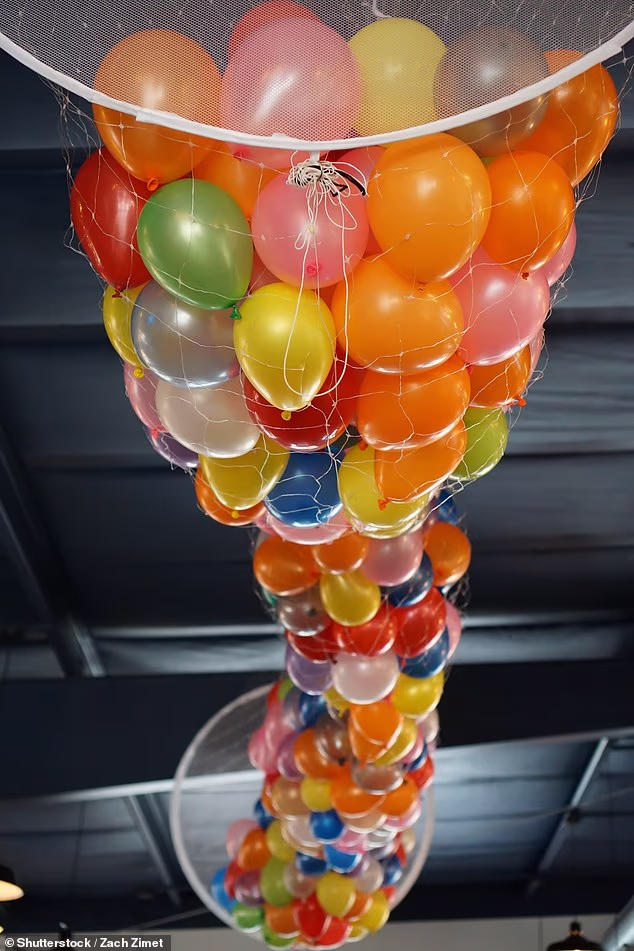 Na contagem regressiva, você puxa a toalha da mesa para soltar uma cascata de balões.