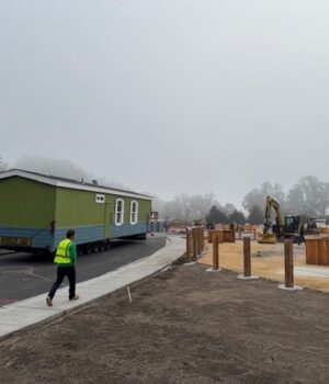 As autoridades do condado disseram que, na costa do condado de San Mateo, três das 47 casas produzidas para a comunidade habitacional acessível chegaram a Stone Pine Cove na terça -feira, disseram autoridades do condado.