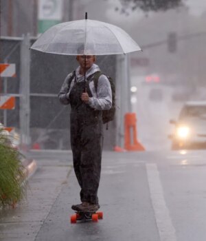Na segunda-feira, 8 de outubro de 2021, um pedestre caminhou sob chuva nos subúrbios junto com uma tempestade no Golfo. (Dye Sugano/Grupo de Notícias da Bay Area)