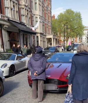 Uma mulher irritada confrontou um motorista do Aston Martin enquanto se curva para um motorista para reconsiderar muito alto.