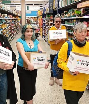 A Take Back Power, cujo objetivo declarado é “tributar os ricos para consertar a Grã-Bretanha”, compartilhou imagens de funcionários roubando mercadorias de uma loja Morrisons em Exeter na manhã de sábado, dizendo que planejavam assumir o controle de lojas na capital no final do dia.