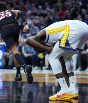 Draymond Green machucou a perna direita no segundo quarto do jogo de quinta-feira na Filadélfia. O grande Dominique Barlow dos Sixers pousou na perna de Green enquanto lutava por um rebote e ele saiu do jogo e não voltou.