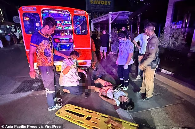 O homem, que estava deitado no chão com uma camisa branca, foi levado na traseira de uma ambulância ao Hospital de Patong para tratamento.