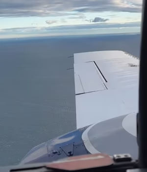 Esta foto tirada de um vídeo de Lizbeth Carroll Fuller mostra o voo 42 da Cape Air voando sobre o oceano aberto com as janelas principais da cabine fechadas.