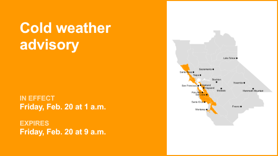 A costa da Bay Area é o foco de um alerta de clima frio emitido pelo Serviço Meteorológico Nacional na quarta-feira às 23h25. A assessoria é válida das 1h às 21h. na sexta-feira, 20 de fevereiro