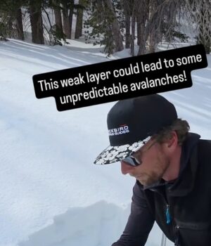 A legenda do vídeo destaca uma fraca camada de neve que pode levar a uma avalanche à medida que uma tempestade se aproxima, pedindo aos esquiadores que “tomem cuidado extra esta semana!”