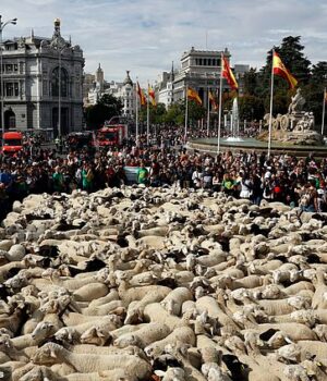Os visitantes do festival Transumância ficaram chocados ao ver cerca de 1.100 ovelhas e 200 cabras perto do marco icónico de Madrid.