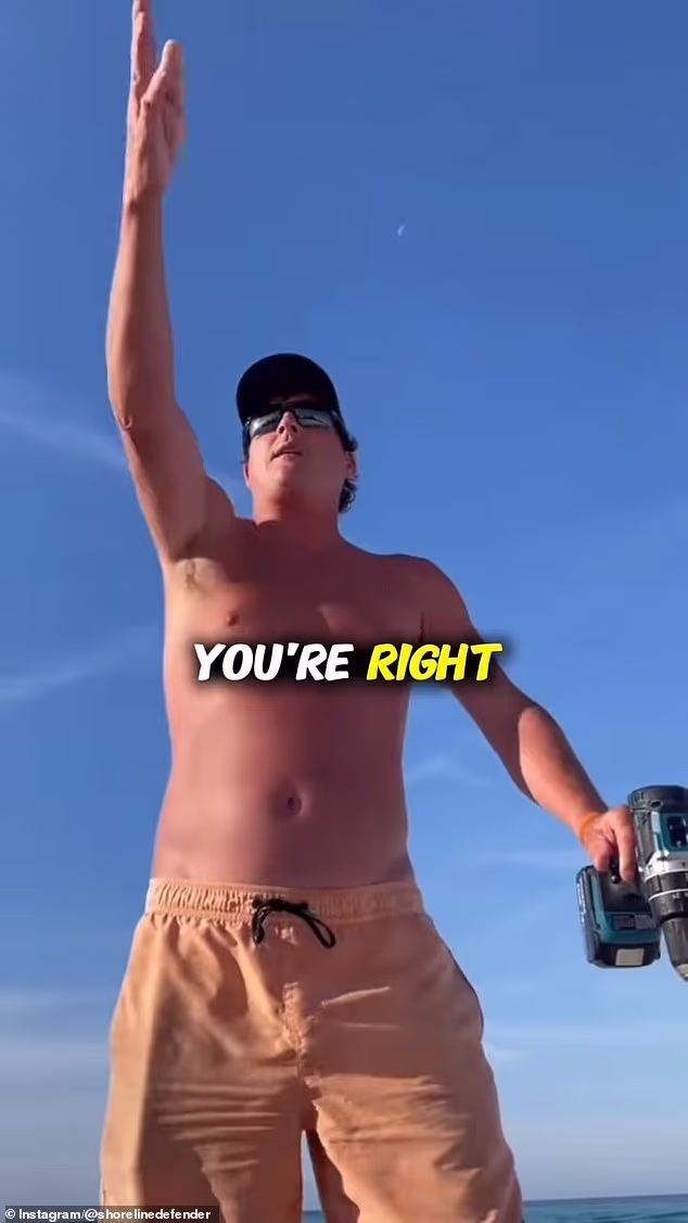 As filmagens das várias brigas mostraram o gerente da propriedade segurando a furadeira na mão enquanto discutia com os banhistas que alegou estarem invadindo a praia particular de Littrell.