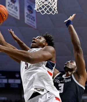 Depois que Georgetown eliminou uma desvantagem de sete pontos e empatou o jogo em 25, Ball marcou 10 pontos em uma sequência de 12-3 e os Huskies lideraram por 41-33 no intervalo.