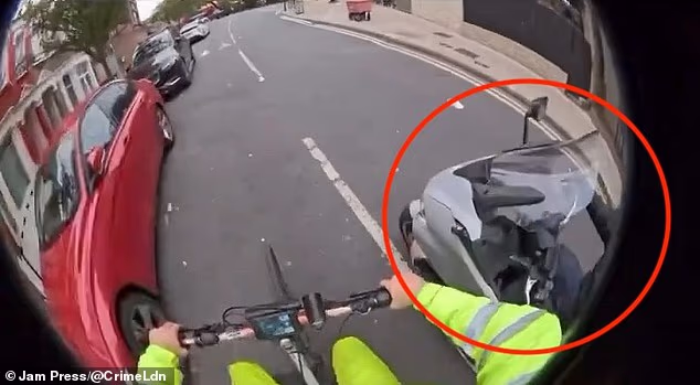 Imagens horríveis capturam o momento em que dois criminosos que andavam de ciclomotor tentaram roubar uma bicicleta elétrica enquanto o proprietário dirigia por Londres