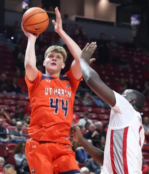 Matas Deneusus do UT Martin Skyhawks atira contra Ladzi Dembele dos rebeldes UNLV em novembro. Deneusus se comprometeu com a URI para a próxima temporada.