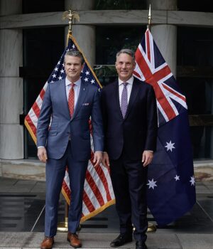 O secretário de Defesa dos EUA, Pete Hegsath (à esquerda), com o ministro da Defesa Australiano Richard Marlez e a Austrália discutiram sua criação de orçamento militar