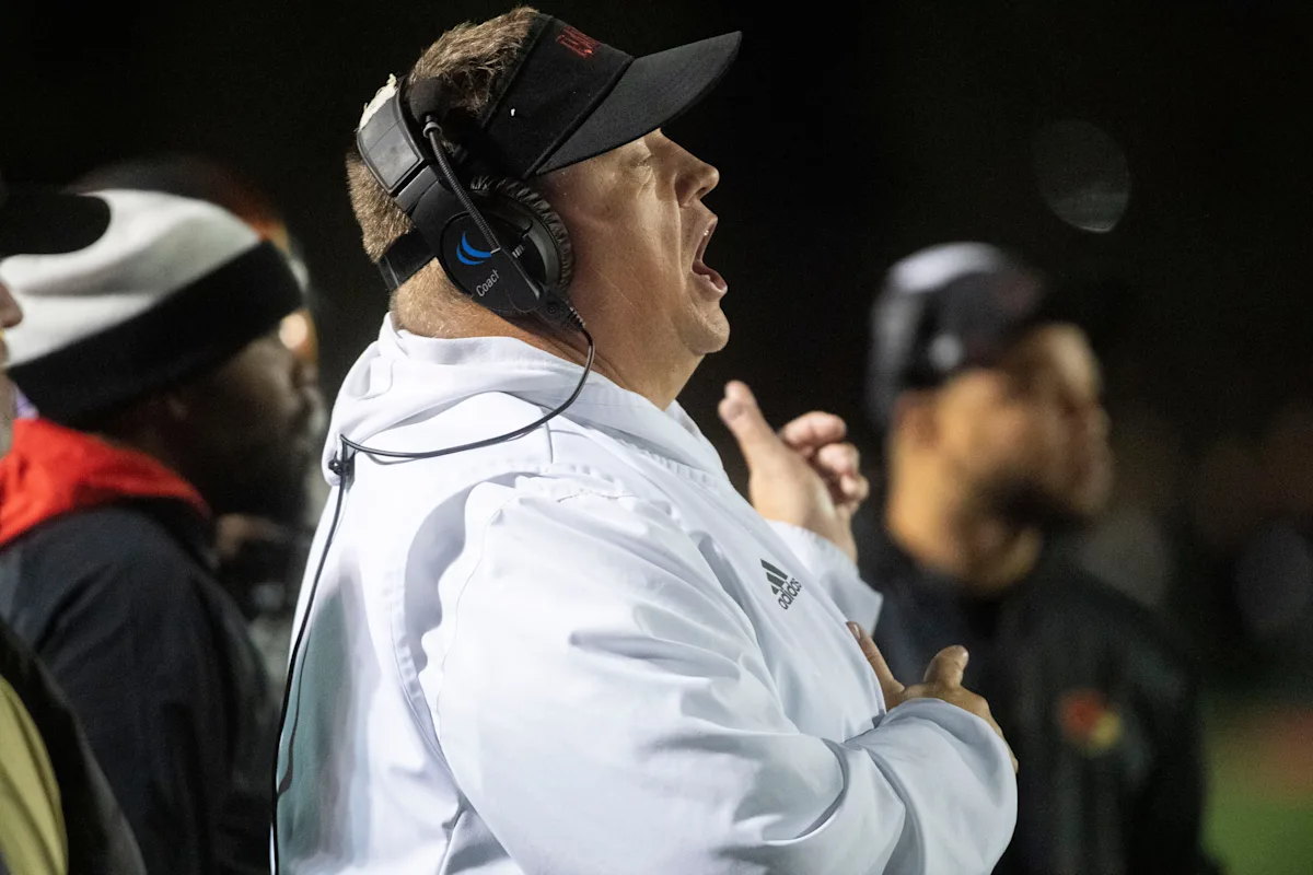 Will Hester é mostrado treinando durante um jogo de futebol americano Ravenwood em 2023. Hester foi nomeado técnico principal do Blackman em 15 de janeiro.