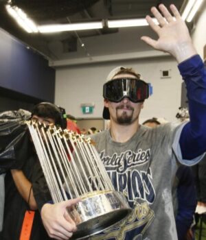 31 de outubro de 2025; Toronto, Ontário, Canadá; O arremessador do Los Angeles Dodgers, Blake Snell (7), comemora com o Commissioner’s Trophy no vestiário após derrotar o Toronto Blue Jays na 2025 MLB World Series no Rogers Center. Crédito obrigatório: John E. Sokolowski-Imagn Images