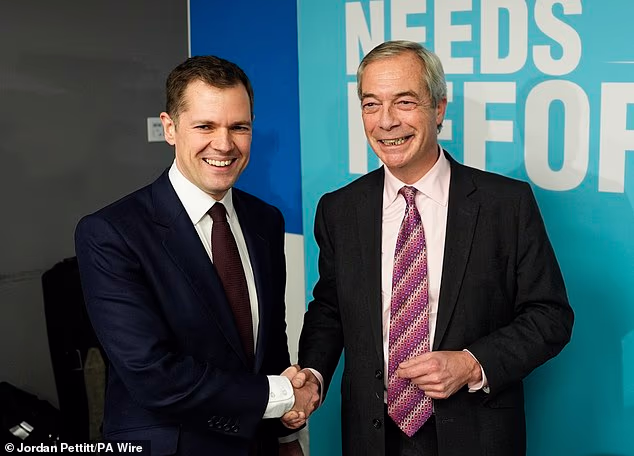 O ex-parlamentar conservador e porta-voz da justiça Robert Jenrick fotografado com o líder Nigel Farage na quinta-feira depois que ele deixou o Reform UK